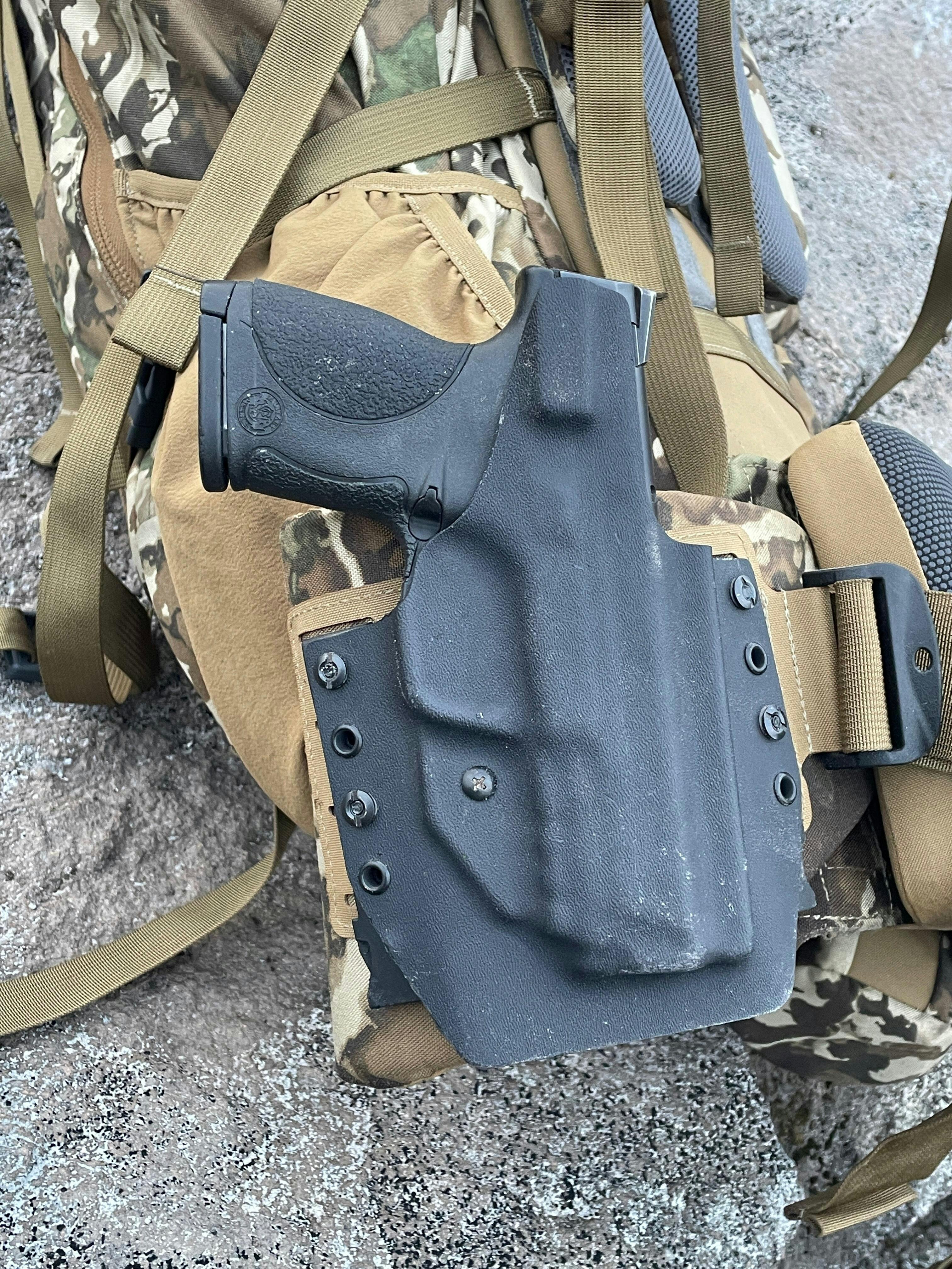 The EMG rig was purpose-built for hunters needing a way to carry a sidearm on the outside of their pack belt. Like our Monarch holster, the EMG is crafted with an 80/20 split design placing the flattest half of the holster toward the body and making it extremely comfortable to carry all day. It sports a natural curve that contours to the hip/belt serving to relieve inward torque. The mold injected clips mount securely to your pack belt and provide excellent stability so your sidearm isn’t excessively rocking back and forth. We extend the sweat guard up both sides of the firearm to protect it while moving through thick cover, and each EMG rig is set with a forward cant so your firearm naturally “presents” itself to your draw hand. Like all of our pistol holsters, the EMG features an adjustable retention system that balances a smooth draw stroke, while ensuring that your weapon stays secure when moving through rough country or taking off your pack. The EMG sports a closed muzzle design (or crowned on larger models) helping to keep your barrel free from debris and snow. Lastly, every Ivory EMG is infused with Irish whiskey and has been blessed by the spirit of Fred Bear to ensure peak hunting performance.